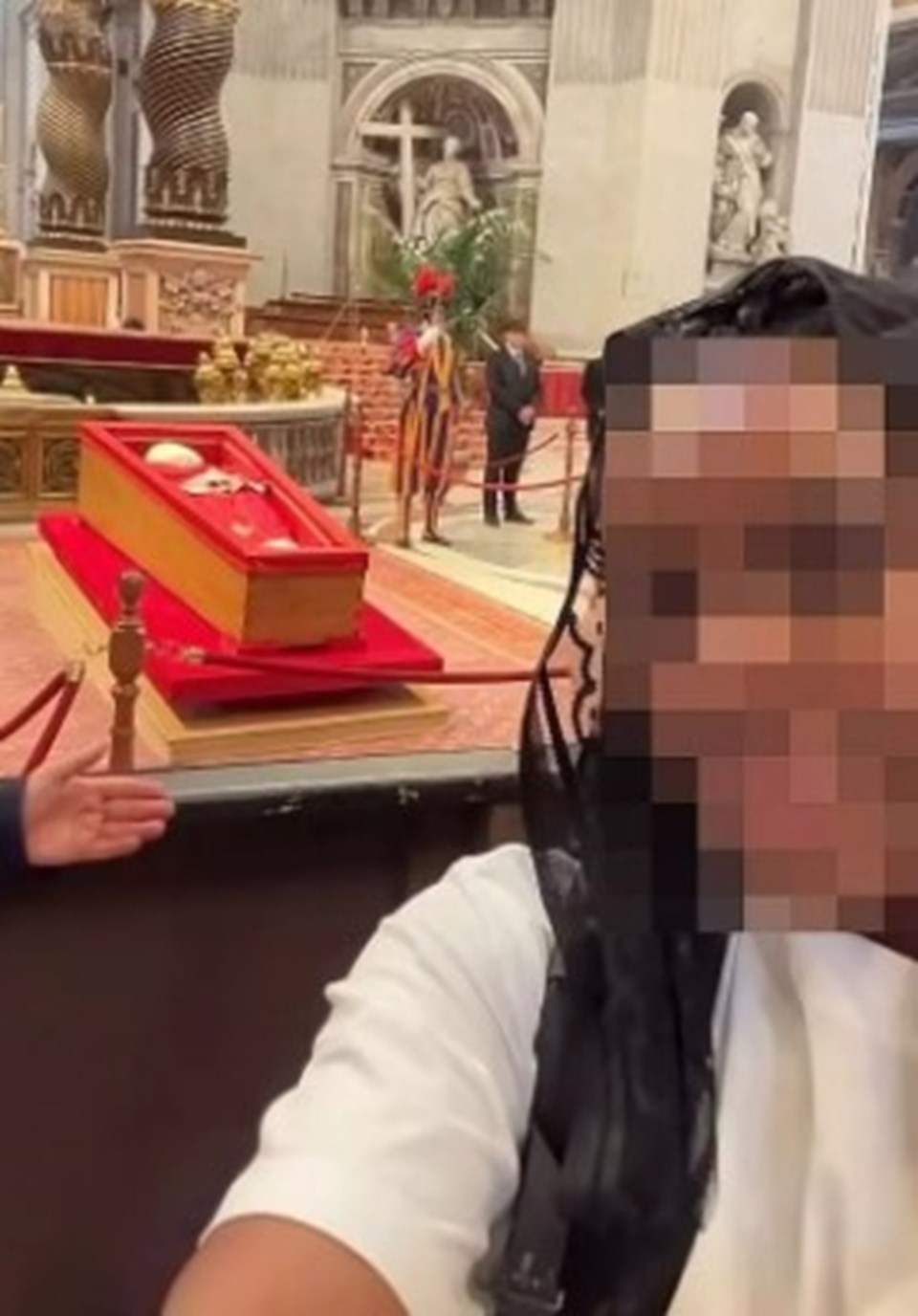 Sosyal medyada paylaşılan bir fotoğrafta, Papa’nın yaklaşık 3 metre ardında kadife kaplı tabutta yattığı sırada kameraya gülümseyen bir bayan görülüyor.
