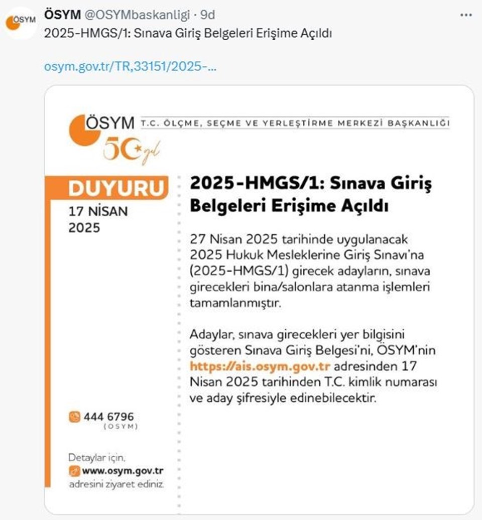 27 Nisan 2025 tarihinde uygulanacak 2025 Hukuk Mesleklerine Giriş Sınavı (2025-HMGS/1) için adaylar, saat 10.00’dan sonra imtihan binalarına alınmayacaktır.” denildi.