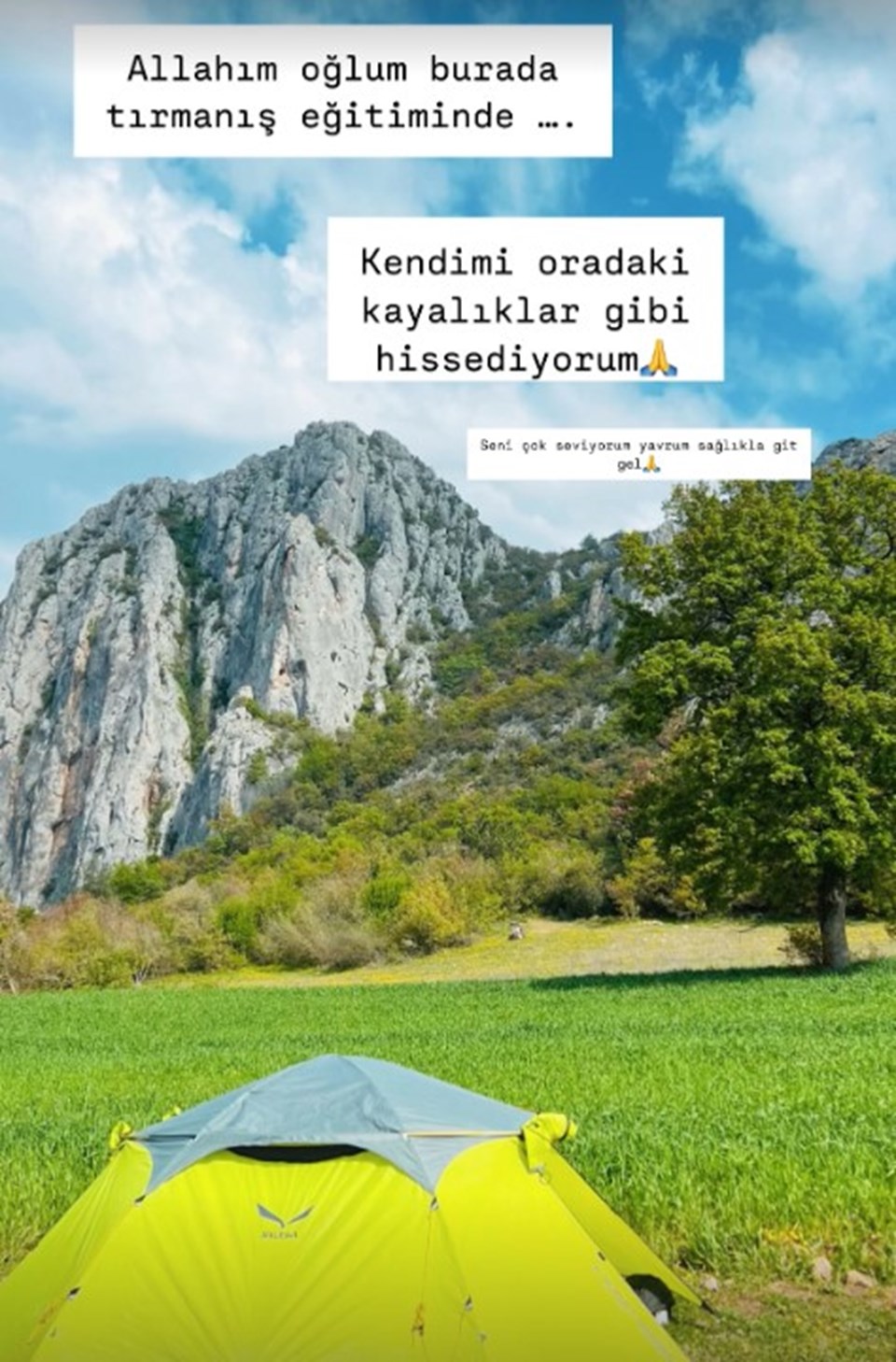 46 yaşındaki sunucu “Allah’ım oğlum burada tırmanış eğitiminde… Kendimi oradaki kayalıklar üzere hissediyorum. Seni çok seviyorum yavrum, sıhhatle git gel.” notuyla paylaşımda bulundu.