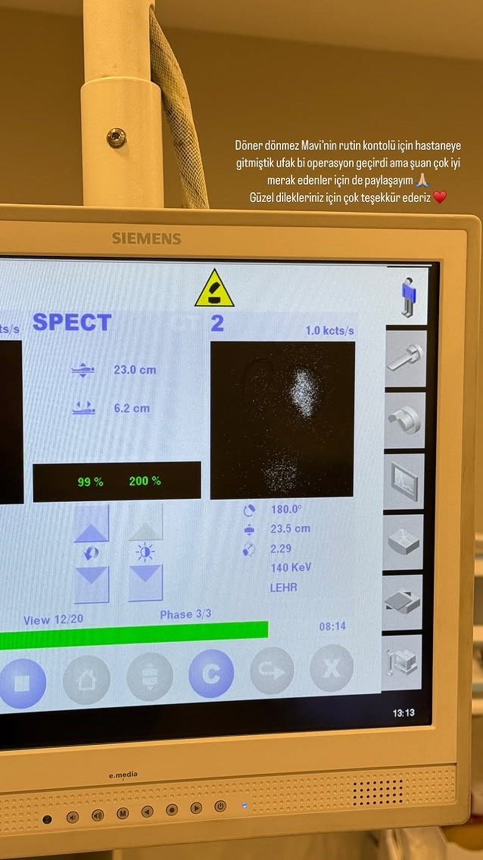 “Döner dönmez Mavi’nin rutin denetimi için hastaneye gitmiştik. Ufak bir operasyon geçirdi lakin şu an çok güzel. Merak edenler için de paylaşayım. Hoş dilekleriniz için çok teşekkür ederiz.”