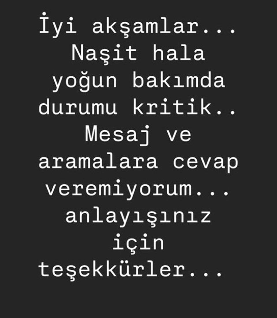 “Naşit hala ağır bakımda, durumu kritik. Bildiri ve aramalara yanıt veremiyorum. Anlayışınız için teşekkürler.”