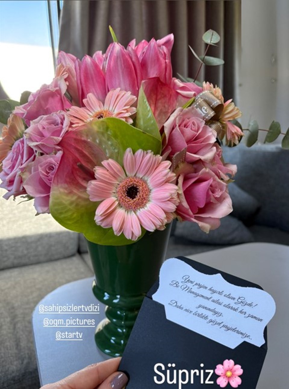 Ünlü oyuncu, müjdeli haberi menajerlik şirketinden gelen çiçekle toplumsal medya hesabından duyurdu. Beğenilen Duru, paylaşımına “Sürpriz” notunu düştü.