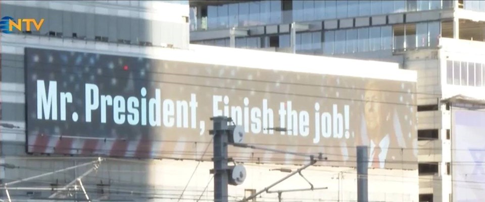 NTV muhabiri Özden Erkuş’un Tel Aviv’den aktardığına nazaran 20 numaralı otobanın kenarında bulunan binanın üzerindeki reklam panosunda hafta içi ABD Başkanı Donald Trump’ın fotoğrafıyla “Mr. President, Finish the job! (Bay Lider işi bitirin) tabiri yer alıyordu.
